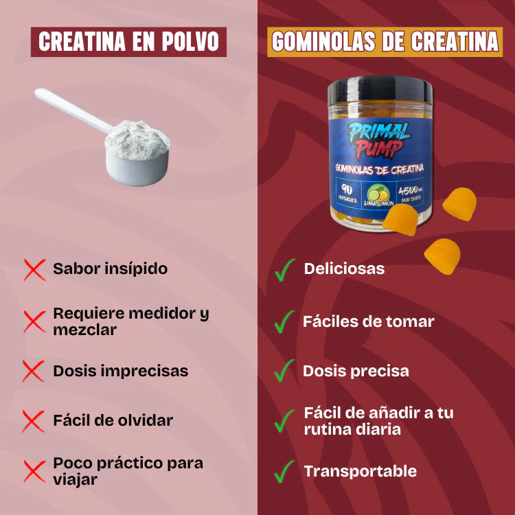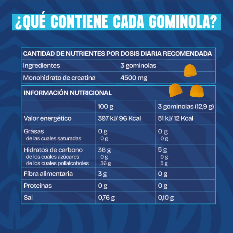 Cada gominola contiene 1.5g de creatina monohidratada. Es el suplemento más estudiado y contrastado para mejorar la fuerza, resistencia y recuperación muscular.