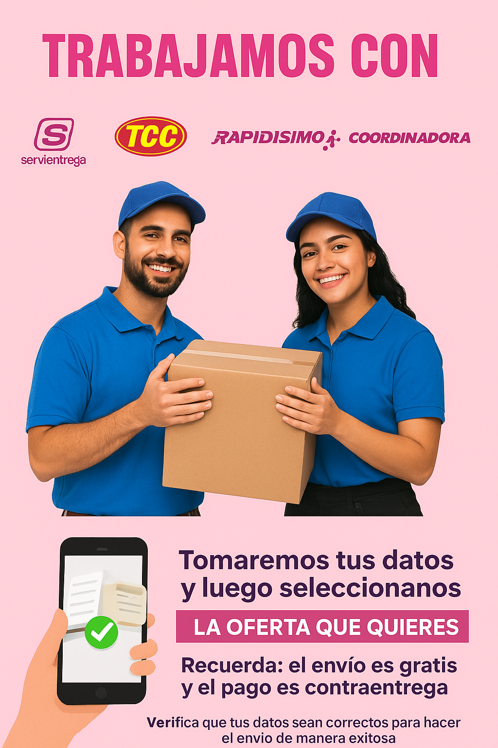 Manejamos envíos gratis con servicio pago contra entrega a todo el país nuestro tiempo de entrega es de 2 a 4 Días Hábiles recuerda tener el dinero completo en EFECTIVO en el momento de la entrega Para que no tengas novedades con la recepción de tu pedido